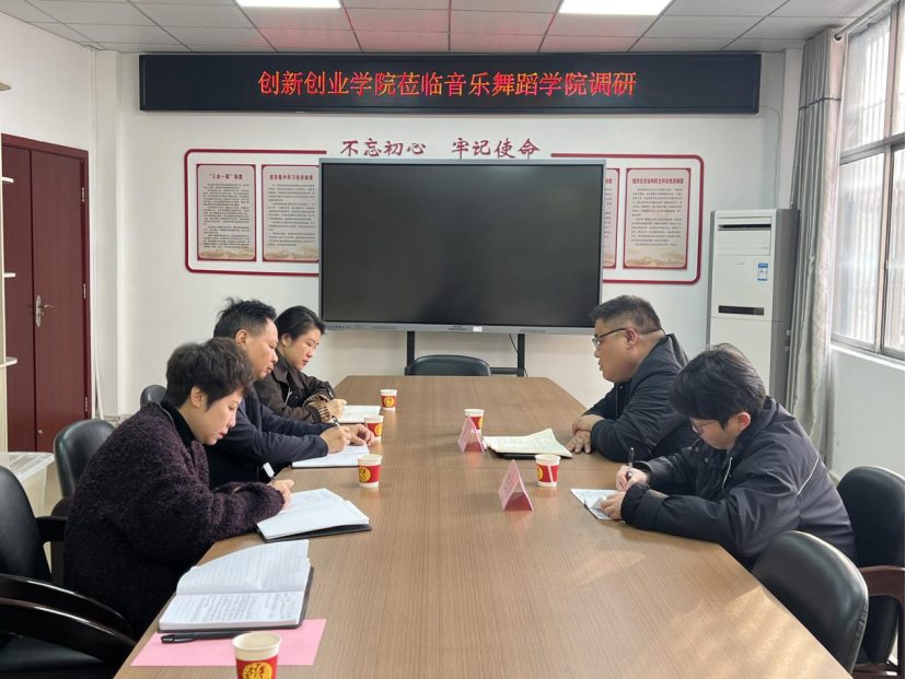 为深化跨学科协同育人机制,推动创新创业教育与艺术专业教学有机融合,2025年12月18日下午,宜春学院创新创业学院院长吴山、副院长文卫及教学与竞赛科科长陈汉璠一行深入音乐舞蹈学院开展调研交流。会议在艺术楼党委会议室举行,音乐舞蹈学院院长刘培发、副院长丁庆、教学与科研管理科科长刘斐共同参会。